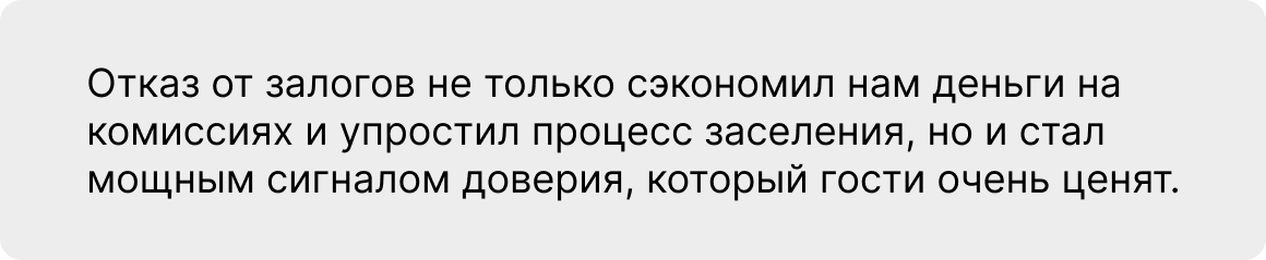 Начну с темы, которая может вызвать споры: мы почти полностью отказались от страховых залогов. Больше не берём их с бронирований, пришедших с площадок со страховкой, и, конечно, с наших постоянных гостей. Раньше эта практика доставляла массу хлопот: прямые переводы создавали гигантский оборот, из-за которого банк однажды заблокировал счёт. Затем мы перешли на холдирование (когда сумма «замораживается» на карте гостя), но это всё равно влекло за собой комиссию платёжного сервиса.