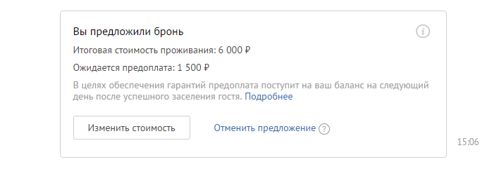 Когда гость присылает вам запрос на бронь, вы указываете общую стоимость проживания и сумму предоплаты, а после этого отправляете гостю предложение.