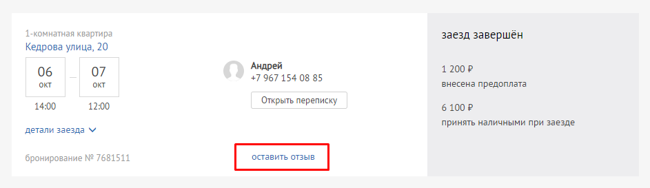 Вы можете и сами оставлять отзывы о гостях, побывавших у вас. Это можно сделать в течение 5 дней с даты выезда. Для этого зайдите в раздел «Брони», найдите нужную бронь и нажмите «Оставить отзыв»: