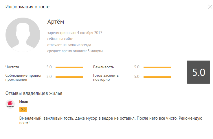 Отзыв появится на Суточно.ру после проверки модератором. Его увидят все арендодатели, у которых этот гость захочет забронировать жилье.