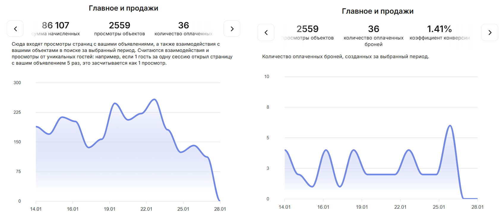 Например, 19 января вы обновили порядок фотографий, и количество просмотров увеличилось. Затем к 25 января просмотры снизились, но пошли бронирования. Интересно, почему? Вернёмся к этому ниже.
