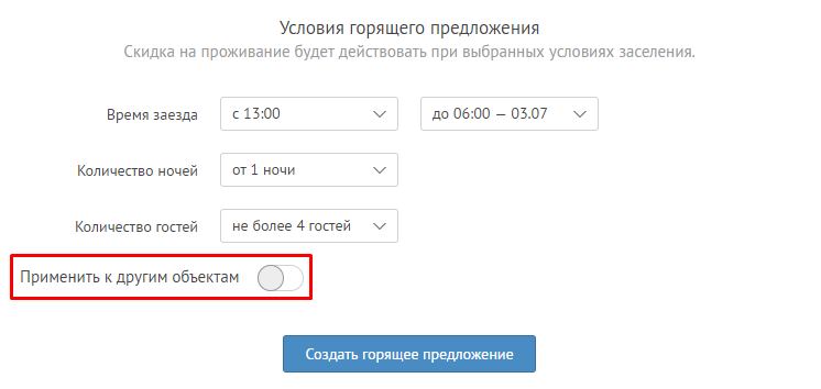 Если вы сдаете несколько объектов, то теперь вы можете всего один раз прописать условия горящего предложения и подключить его ко всем объявлениям сразу. Не нужно указывать условия для каждого жилья в отдельности.