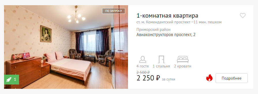 На Суточно.ру есть бесплатная услуга «Горящее предложение». Вы можете указать скидку при заселении в текущий день и быстро сдать жильё. Ваше объявление будет выделено специальным значком в поиске, а гости увидят цену со скидкой: