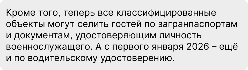 – После классификации вы оказываете гостиничные услуги, поэтому должны придерживаться всех законов и нормативных актов Российской Федерации. В том числе, и постановки на миграционный учёт. Если речь об иностранных гостях, вы должны направить уведомление об их прибытии в органы МВД в течение одного рабочего дня. Что касается российских граждан, ситуация следующая: