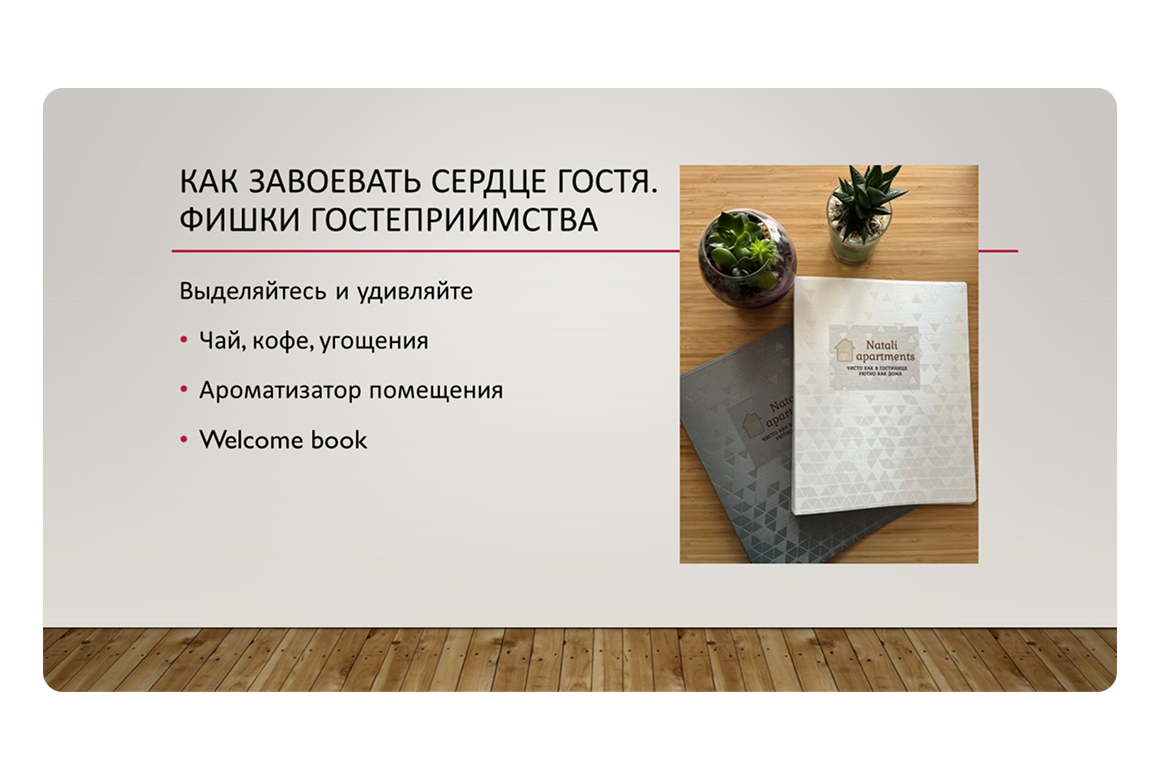 «В наших велком-буках есть раздел с рекомендациями от нас и наших гостей о неочевидных, но интересных местах поблизости. Например, уютная кофейня за углом или смотровая площадка с потрясающим видом. Гости очень ценят такую информацию», — делится Натали.