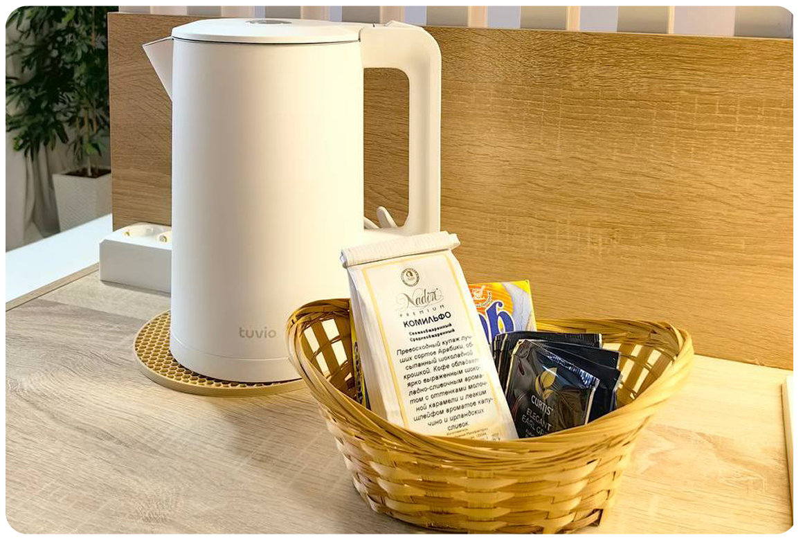 - Приветственный набор. Бутылка воды, чай/кофе, лёгкие закуски, салфетки и пара капсул для стирки создают ощущение заботы.