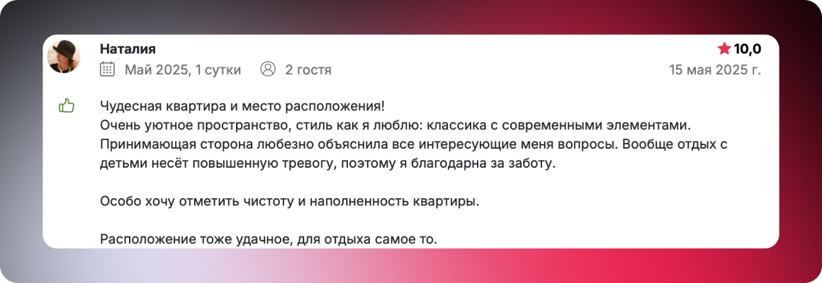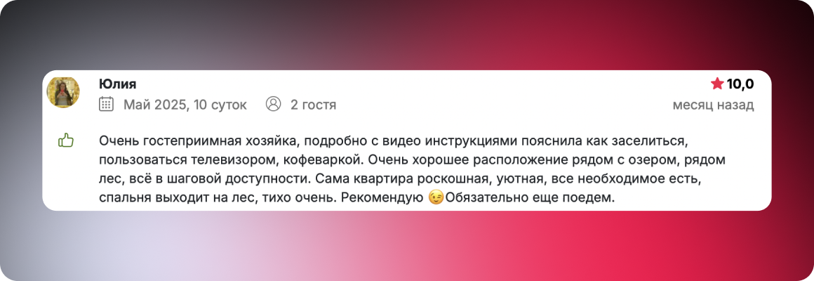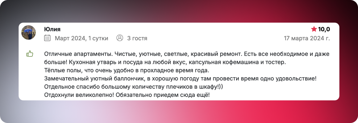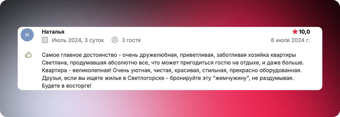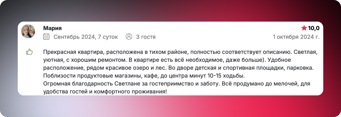 Привет! Меня зовут Светлана Агапова, я работаю в посуточной аренде более 10 лет — и за это время успела хорошо понять, какой сервис нужен гостям, чтобы они стали постоянными.