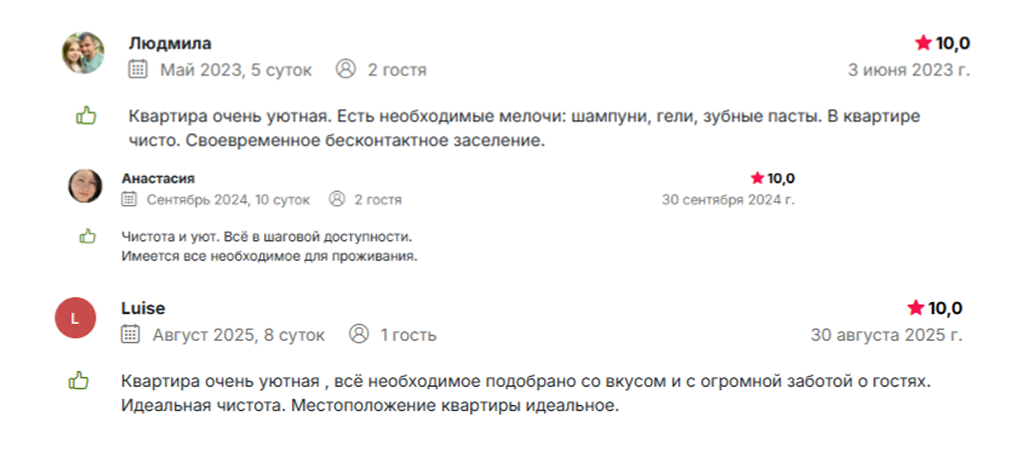 Мне процентов 95 отдыхающих пишут, что в наших квартирах красиво, уютно, чисто. Очень много хороших слов получаю.