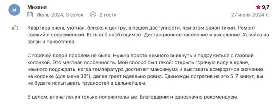 Что-то берём из отзывов. Хорошо, что в Суточно.ру их могут писать только те, кто реально бронировали объект – они часто делятся полезной информацией для следующих гостей. Пример: у нас в городе практически нет центрального горячего водоснабжения – почти всё на газе. И как-то один из наших жильцов написал в отзывах инструкцию, как пользоваться газовой колонкой. Те, кто после него заселялись, пользовались ею.