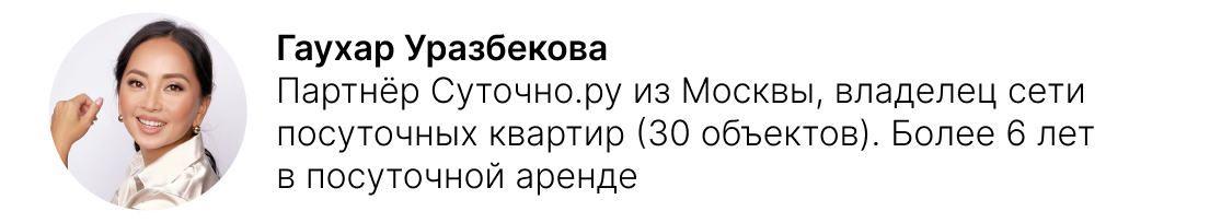 Гаухар Уразбекова – владелица управляющей компании в Москве. Во время турбулентных периодов она и её команда перестали надеяться на случай и начали системно работать с Суточно.ру. Использование инструментов продвижения площадки привело к заметному росту эффективности и стабильному увеличению бронирований.