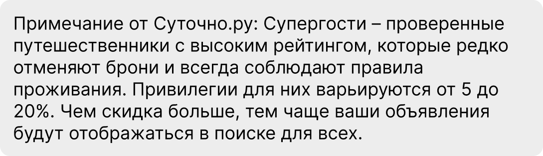 Одна из новинок продвижения – дополнительная скидка для Супергостей. Минимальные 5% не только делают наше предложение более привлекательным и видимым (благодаря специальным значкам на площадке), но и помогают привлекать благонадёжных, постоянных отдыхающих.
