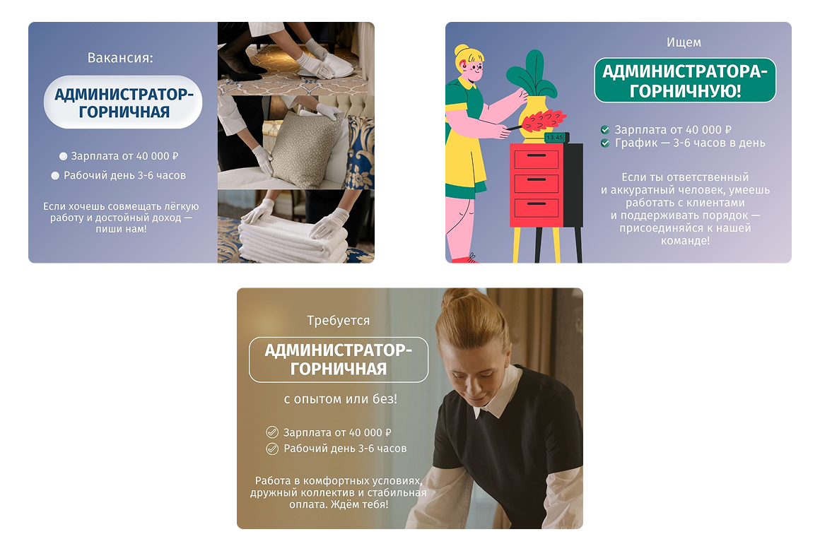 Чтобы быстро найти подходящих сотрудников, мы размещаем вакансии на нескольких площадках: доски объявлений, мессенджеры и чаты мессенджеров.