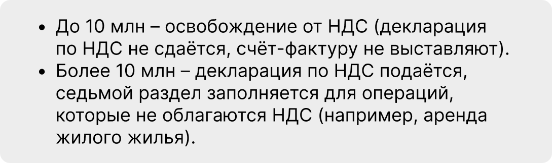 Порог дохода для сохранения освобождения от НДС снижается с 60 до 10 миллионов рублей. Что это значит? Что если в текущем году ваша выручка превысила 10 миллионов рублей, то в следующем нужно будет применять УСН с НДС. Если превышения в 2025 не было, то в 2026 обязанность по НДС возникнет в следующем месяце после превышения лимита.