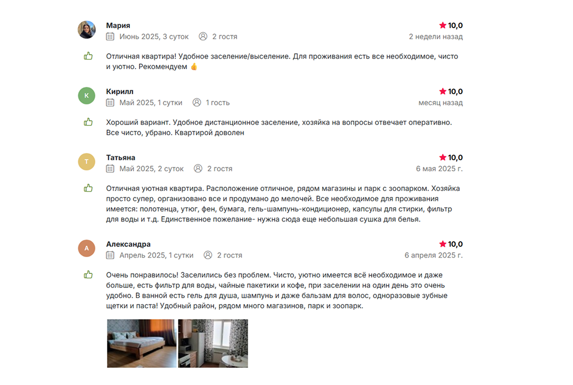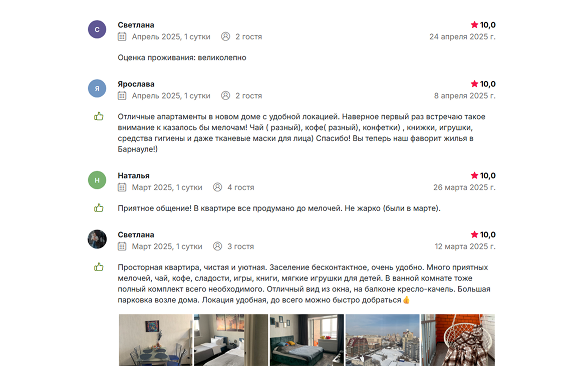Душой не кривлю, стараюсь, чтобы объекты были максимально наполнены. Когда гости уезжают, мы каждому пишем благодарность, что выбрали нас. Следом отправляем сообщение, что были бы признательны за отзыв. На Суточно.ру, как правило, все оставляют. С вашей мотивацией для гостей всё вместе хорошо работает.