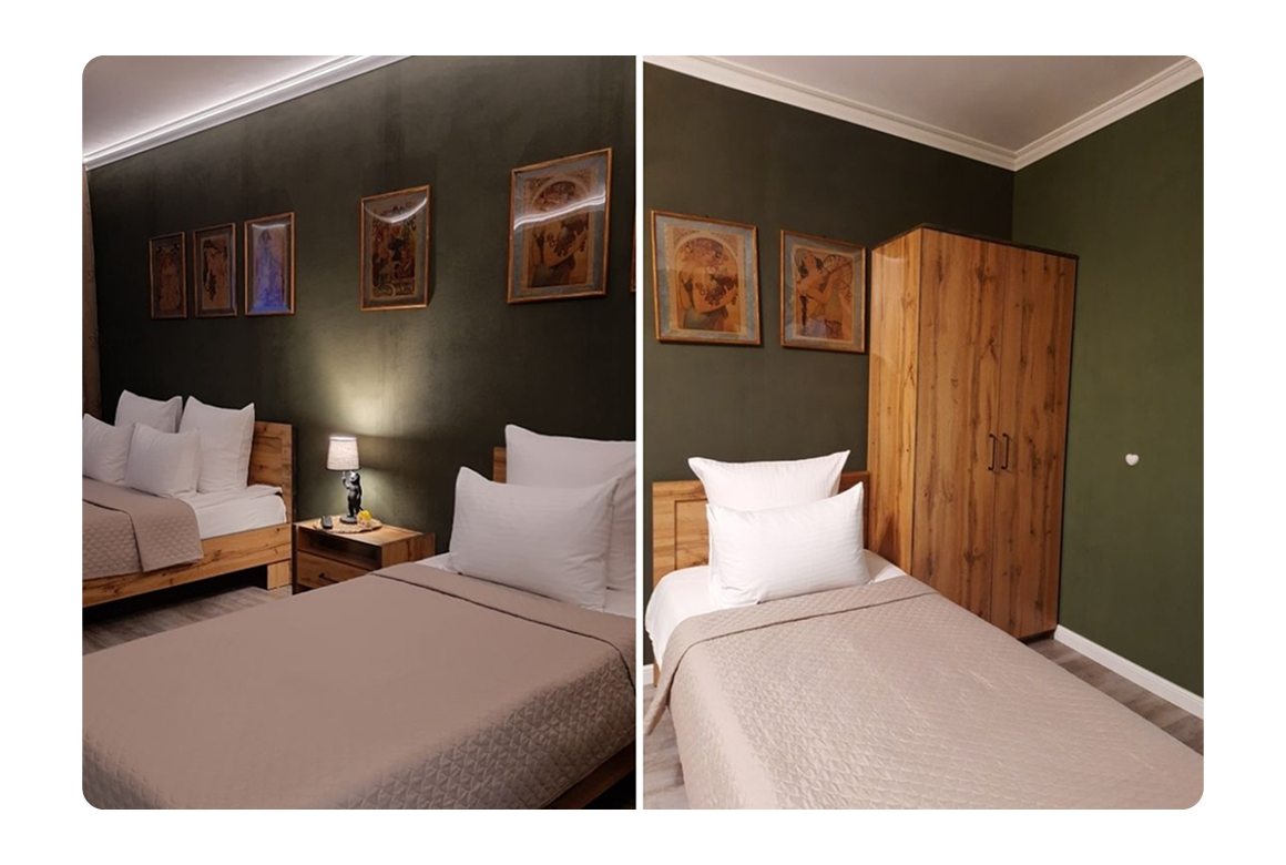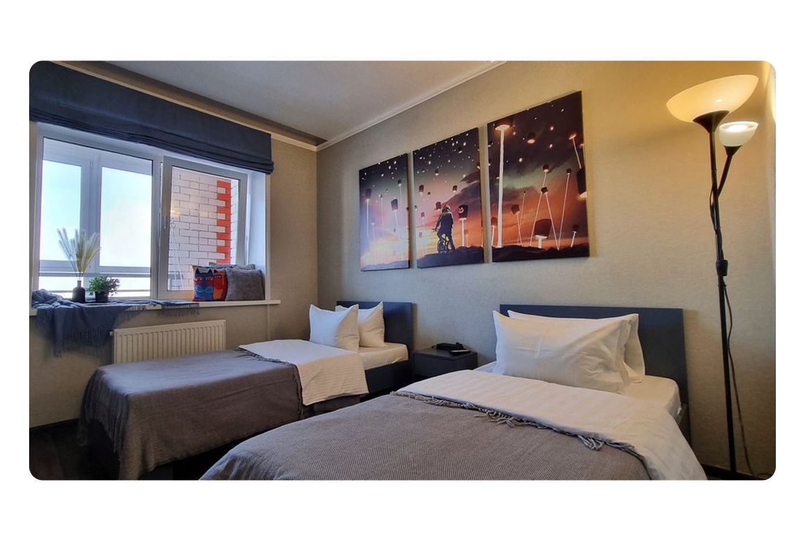 В апартаментах «Рыжий Кот Центр» решились на другой эксперимент. Изначально там стояли 2 двуспальные кровати: одна в изолированной спальне и вторая — в большой гостиной. Первые полгода заселяемость оставляла желать лучшего. Поэтому мы заменили одну двухспалку на 2 односпальные кровати. Сегодня это одни из самых популярных наших апартаментов.