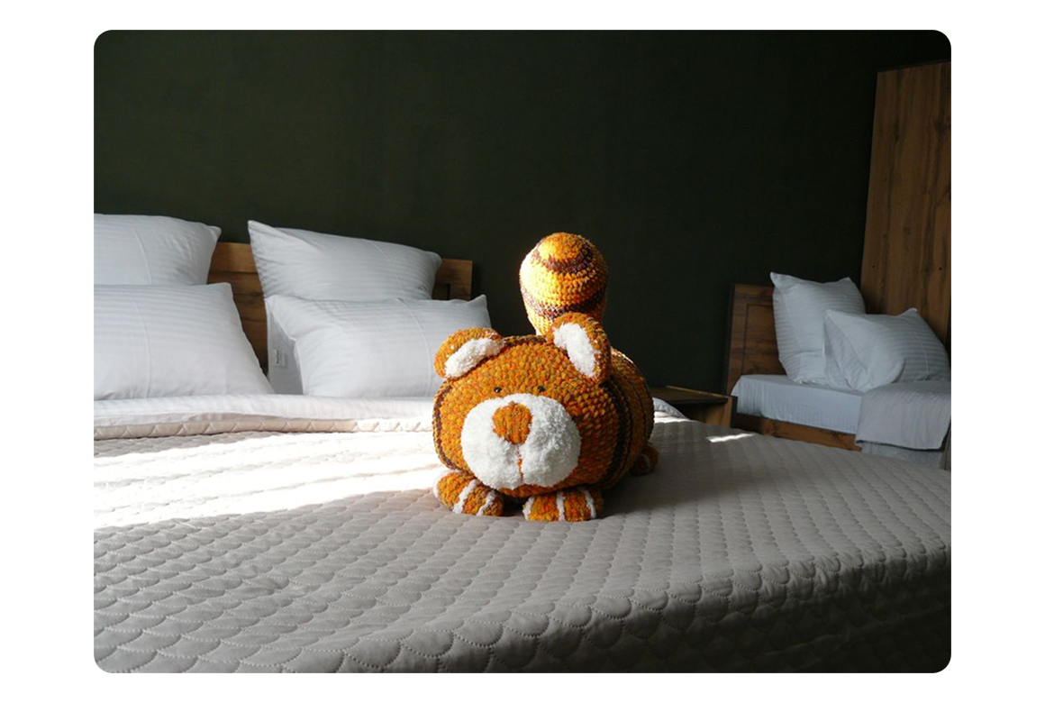 Именно в спальных местах мы нашли своё конкурентное преимущество. В спальне объекта «Рыжий Кот Дружный» разместили 2 кровати — двуспальную и односпальную. Диван-кровать в гостиной также оставили. С одной стороны, это увеличение спальных мест без ущерба для комфорта, с другой стороны — ещё и разделение, что важно для взрослых разнополых детей или коллег в командировке.