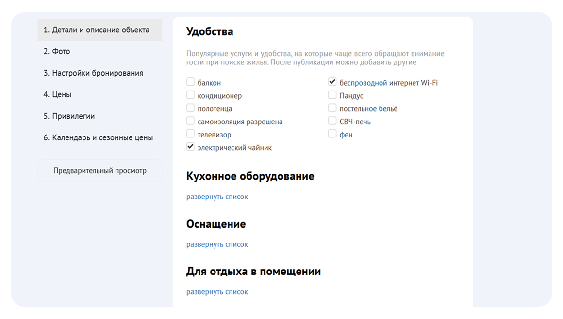 Они включают в себя важную для гостя информацию о вместимости, спальных местах, оснащении, инфраструктуре, удобствах, парковке, ремонте, доступности, правилах проживания и много другом. Выберите соответствующие вашему объекту параметры и максимально подробно проставьте галочки: это не трудно – представьте, что заполняете анкету.