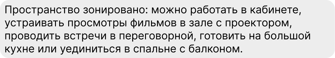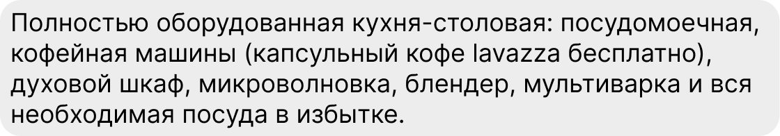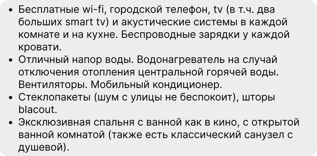 2. Не пренебрегайте дополнительной информацией: напишите об удобствах и оснащении жилья по максимуму. К примеру, о шторах блэкаут или кухонном оборудовании, на котором можно готовить еду для маленьких детей. О скорости интернета, особенностях водоснабжения (если такие есть) и прочих важных для проживающего нюансах.