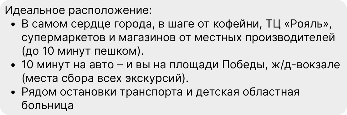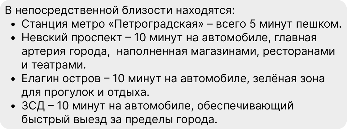 4. Опишите инфраструктуру рядом с объектом. Лучше не просто перечислить, какие заведения в пешей доступности, а указать расстояние до них: не «рядом круглосуточный магазин», а что до него всего 100 метров. Или что в самом доме находится кофейня, где по утрам можно вкусно завтракать. Укажите, сколько займёт путь до ближайшей остановки общественного транспорта или что «через дорогу – торговый центр, от которого ходит бесплатный автобус».