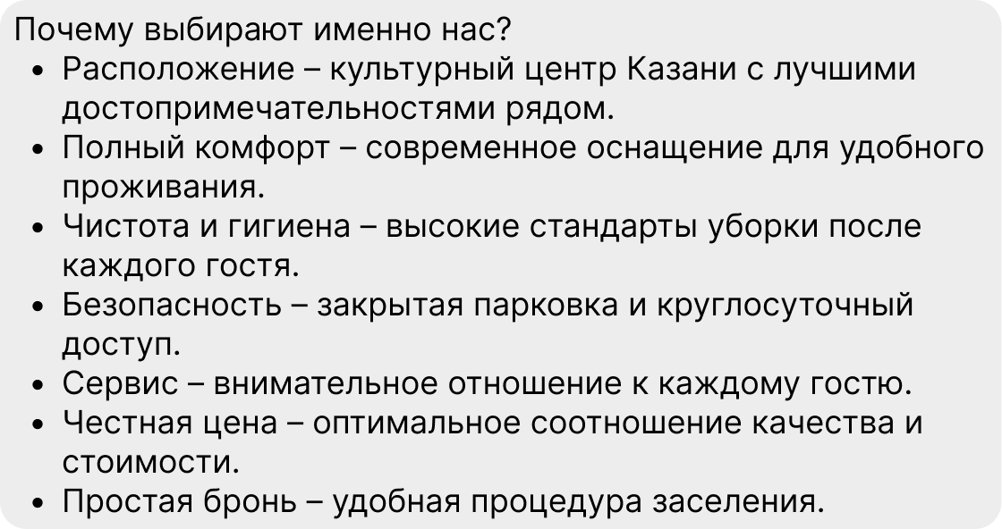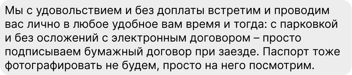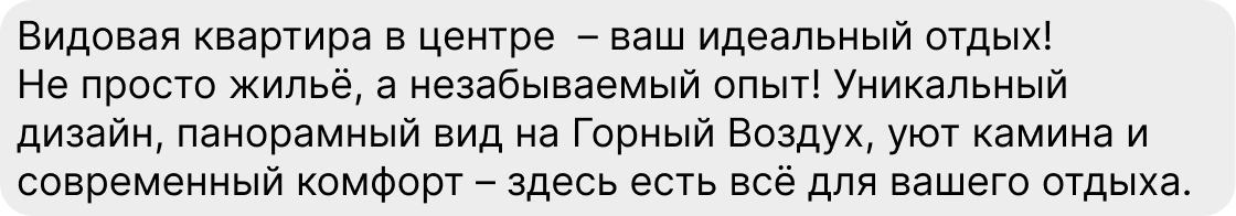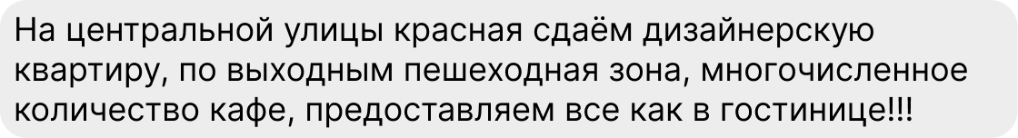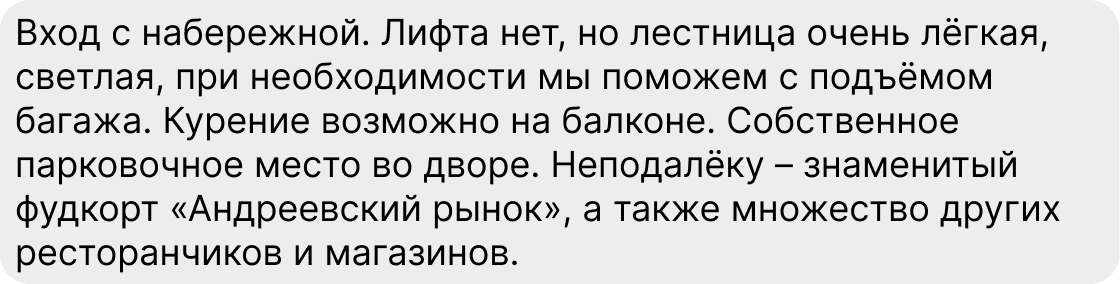По результатам нашего исследования, гости на 30 % чаще выбирают объекты с описанием от 1 000 символов (это примерно 20 предложений), чем объявления в 250 символов. При этом важна не только длина, но и само содержание: чтобы а) человеку захотелось дочитать до конца, б) после прочтения у него не осталось вопросов.