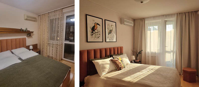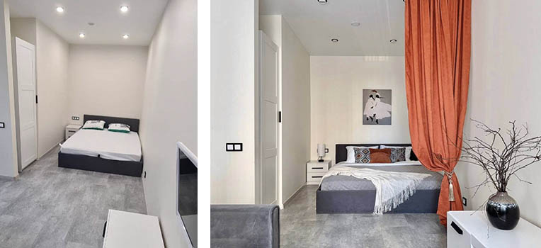 Пример от профессионала: Татьяна Ковалева, автор проекта квартиры в посуточную аренду в Москве, делится: «С помощью яркой шторы был создан не только привлекающий внимание акцент, но и прекрасное зонирование, отделяющее спальную зону от зоны гостиной. Такой прием помогает создать ощущение интимности и защищенности. К тому же идеально подходит людям, любящим поспать чуть подольше в полумраке».