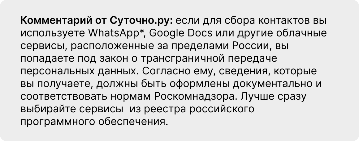 1. Проверьте, где хранятся данные. Если вы используете WhatsApp* или Google Docs, срочно переходите на лицензированные CRM или защищённые компьютеры. Защищённым можно считать компьютер, который соответствует требованиям информационной безопасности, установленным законодательством РФ. Это может быть обычный ПК, но с установленным лицензионным антивирусом, файрволом, ограниченным доступом (например, паролем) и шифрованием данных. Такой компьютер не подключён к несертифицированным облачным сервисам и не используется для пересылки данных через незащищённые мессенджеры.