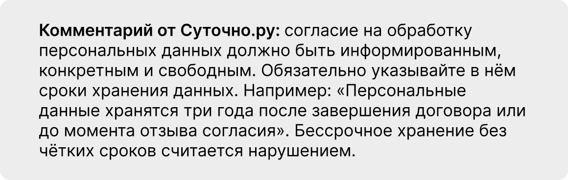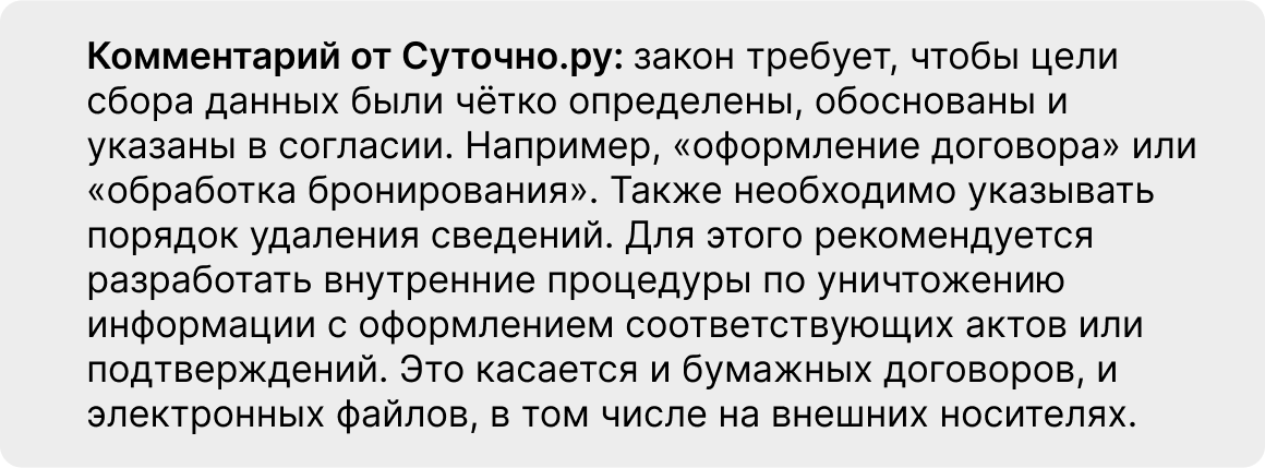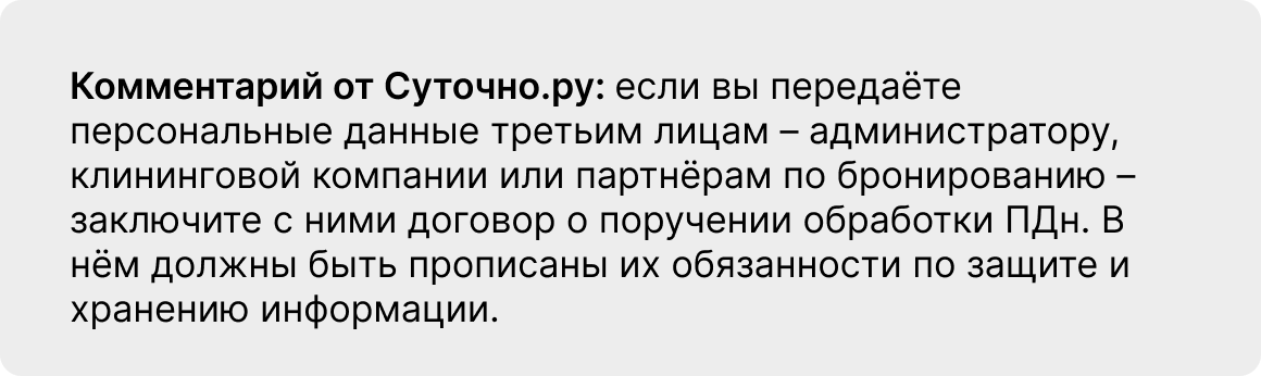 Если хотите отправлять клиентам информацию об акциях – например, о скидках на аренду посуточно, – получите отдельное согласие на рассылки. Без него ваша маркетинговая активность может обернуться жалобой.