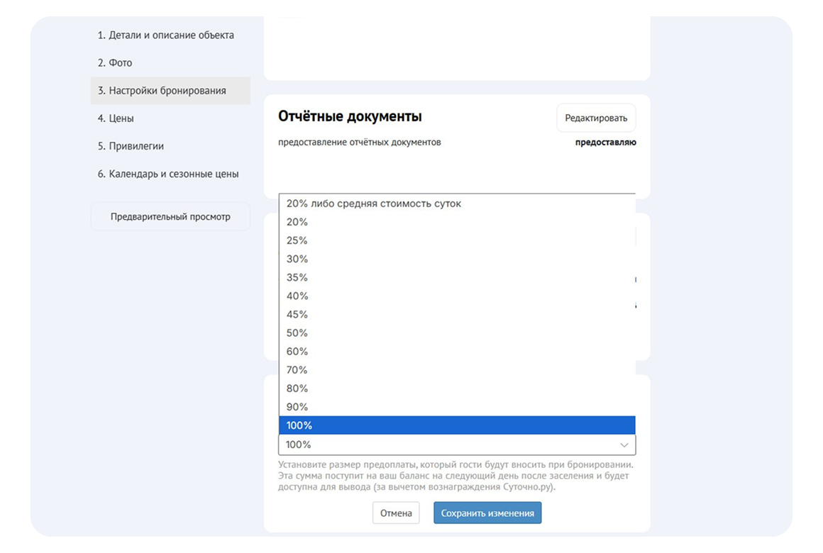 Если сотрудничаете с нами по схемам «Бизнес», «Бизнес Плюс» и «Бизнес Максимум», то можете принимать до 100% от стоимости проживания напрямую через сайт и сами управлять размером предоплаты. Это удобно, если у вас бесконтактное заселение, или вы хотите быть уверены, что гости точно приедут. Ведь чем больше сумма предоплаты, тем вероятность того, что гость не отменит свою бронь, выше.