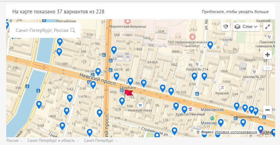 После этого он выбирает вариант из списка и сразу видит предложения в районе нужной улицы, которая отмечается красным флажком.