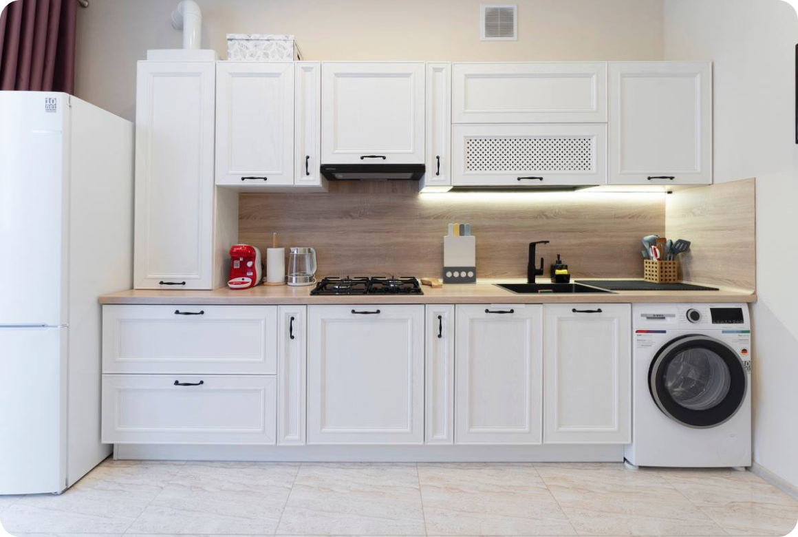 По нашему опыту нужны холодильник, стиральная машина, телевизор, чайник, плита, фен, утюг, СВЧ-печь и вытяжка. По желанию и возможностям арендодателя можно установить духовку, кофемашину и посудомоечную машину. Здесь ещё многое зависит от планировки и площади квартиры.