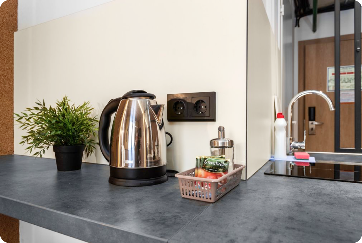 Последнее время комплектуем квартиры настольными индукционными плитками. Они хранятся в ящике стола и не занимают много места. Если кто-то из гостей захочет воспользоваться, спокойно достанет плитку и приготовит обед. Правда, горничные отмечают, что это редко происходит. А значит, снова сокращаем время уборки.