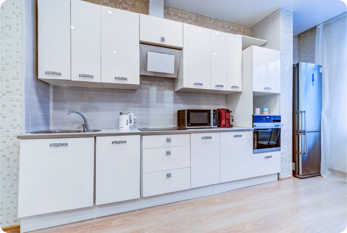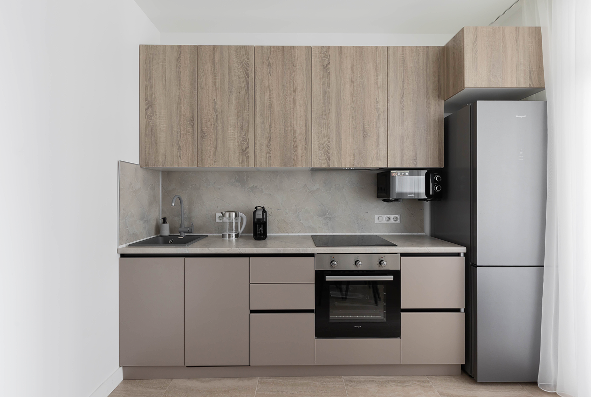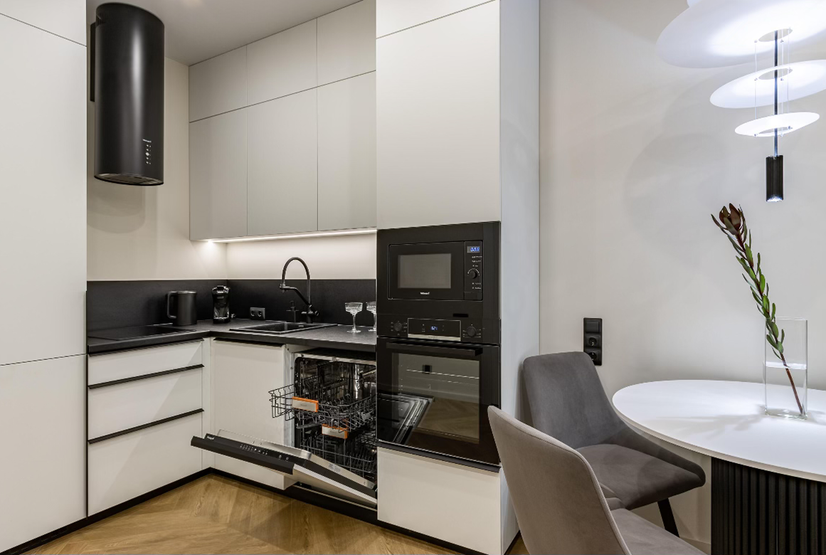 Мы стараемся как можно плотнее укомплектовать квартиры техникой: на кухне всегда есть посудомоечная машина, вытяжка, стационарная плита или индукционная, которую можно убрать в шкаф. Также обязательны чайник и СВЧ-печь. Мы не ставим в своих квартирах кофемашины, потому что многие гости не умеют ими пользоваться. К тому же тяжело поддерживать постоянный ассортимент кофейных капсул.