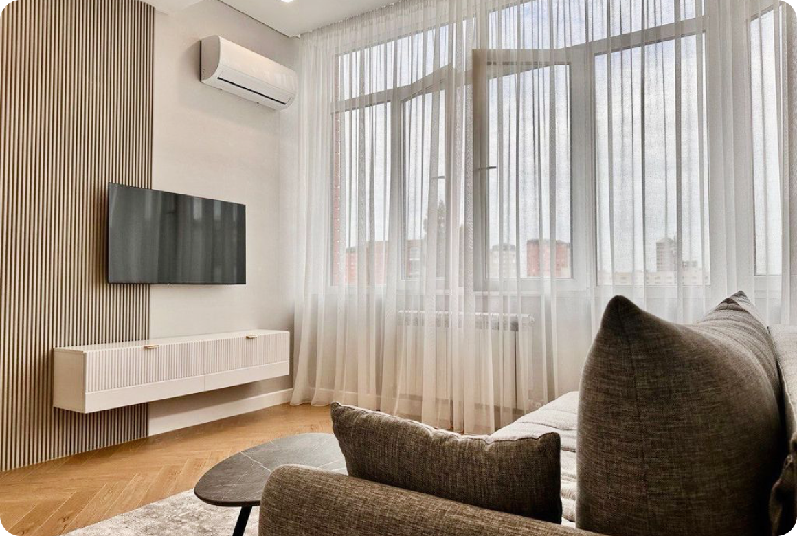 Из развлечений в наших квартирах мы используем телевизор или проектор. Также в нескольких объектах есть колонки «Алиса». Везде обязательно установлен кондиционер.
