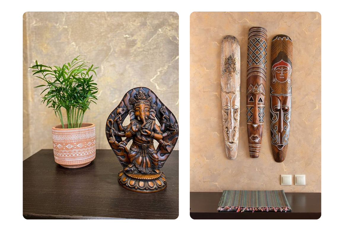 – Муж долгое время работал в сфере туризма и посетил много стран, в том числе Индию. Оттуда он привёз слонов из дерева, разные фигуры Шивы. Этнические индийские маски мы купили в Пятигорске — в магазине «Индокитай».