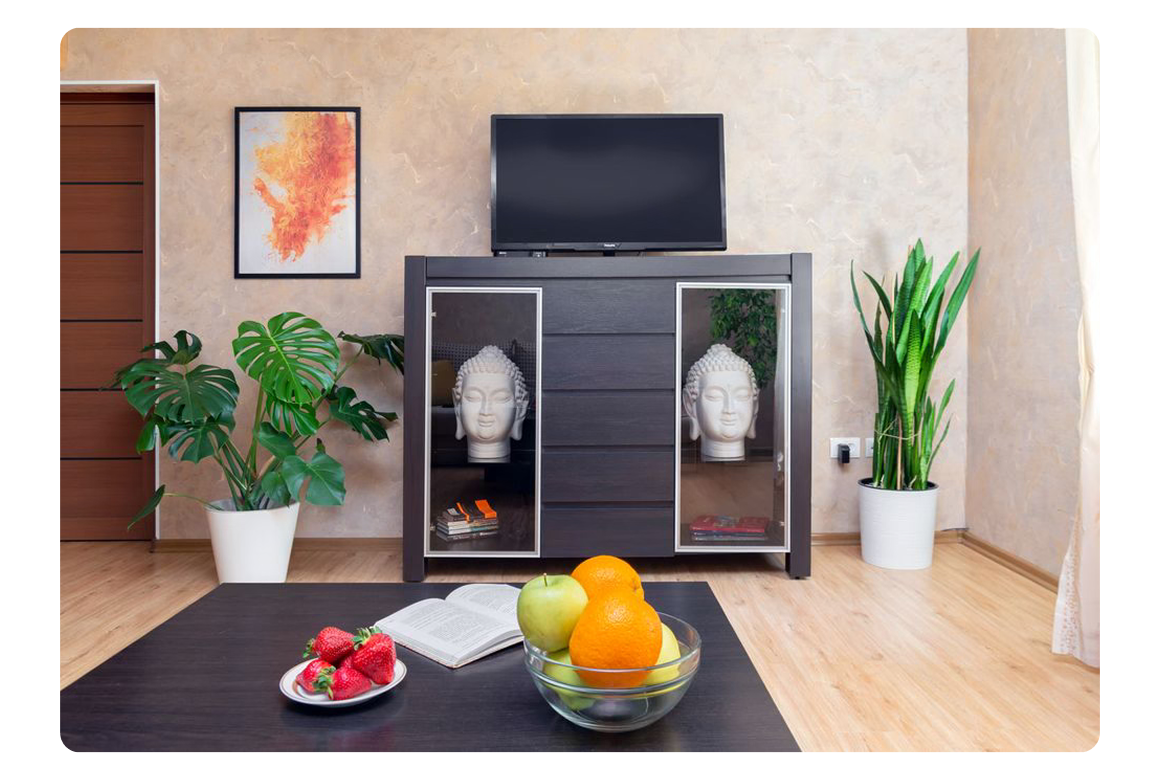 Головы Будды купили в одном книжном, так как они отлично вписывались в интерьер квартиры. Между прочим, они цепляют многих гостей, потому что они большие, оригинальные, их видно на фотографиях. Особенно нравятся людям, которые занимаются йогой, они к нам там тоже приезжают.